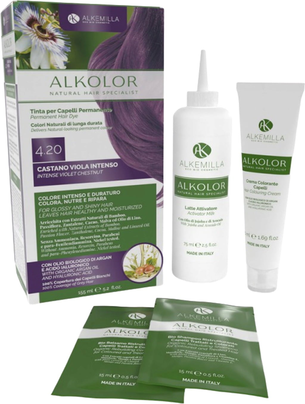 Alkolor 4.2 Intense Violet Chestnut Natural Hair Dye är en permanent hårfärg som är fri från ammoniak, resorcinol, parabener och parafenylendiamin. Den veganska kvalitetsformulan är nickeltestad och inte testad på djur. Ekologisk arganolja och linolja blandas med fuktgivande och remineraliserande växtextrakt som bambu, passionsblomma, kakao och malva för ett rikt färgresultat och intensiva reflektioner. Vitt hår får en perfekt täckning. Tack vare hyaluronsyra är håret väl omhändertaget, återfuktat och glansigt.