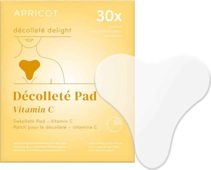 Med Vitamin C dekolletage-pads från APRICOT kan du intensivvårda hyperpigmenterad eller solskadad hud i dekolletageområdet. Padsen är tillverkad av medicinsk silikon och berikad med antioxidanten C-vitamin, vilket kan släta ut linjer och rynkor. Den kan återanvändas upp till 30 gånger.