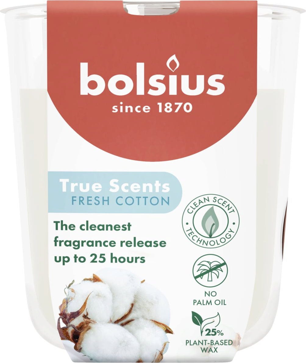 Doftljuset Bolsius True Scents i glasburk ger optimal doftfördelning i dina bostäder i upp till 25 timmar. Tack vare Freshplex™-tekniken hjälper det till och med till att neutralisera tobaksrök. Ljuset är delvis tillverkat av vegetabiliskt vax och är palmoljefritt.