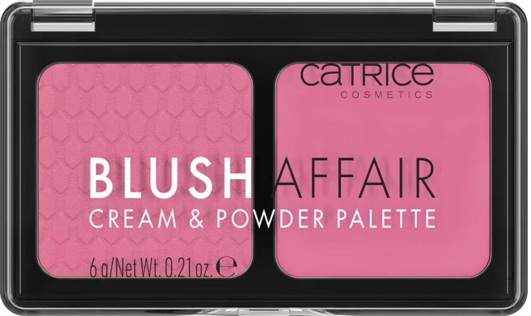 Blush Affair Cream & Powder Palette från Catrice kombinerar en krämig och en puderig rouge i högpigmenterade färger. Båda texturerna är särskilt lätta att applicera på huden och blanda. Vid behov kan du även applicera rougen i lager på få en mer intensiv färg. Bluschen är vegansk och fri från mikroplast.