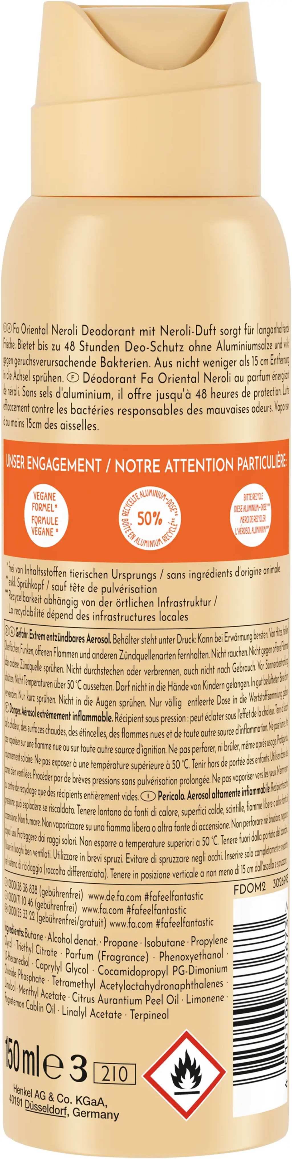 Fa Oriental Moments deodorantspray fräschar upp dina armhålor länge med en orientaliskt kryddig doft av ökenros och sandelträ. Den veganska formulan är skonsam mot huden och bekämpar på ett tillförlitligt sätt luktframkallande bakterier. Utan aluminiumsalter och utan deodorantrester på dina kläder.