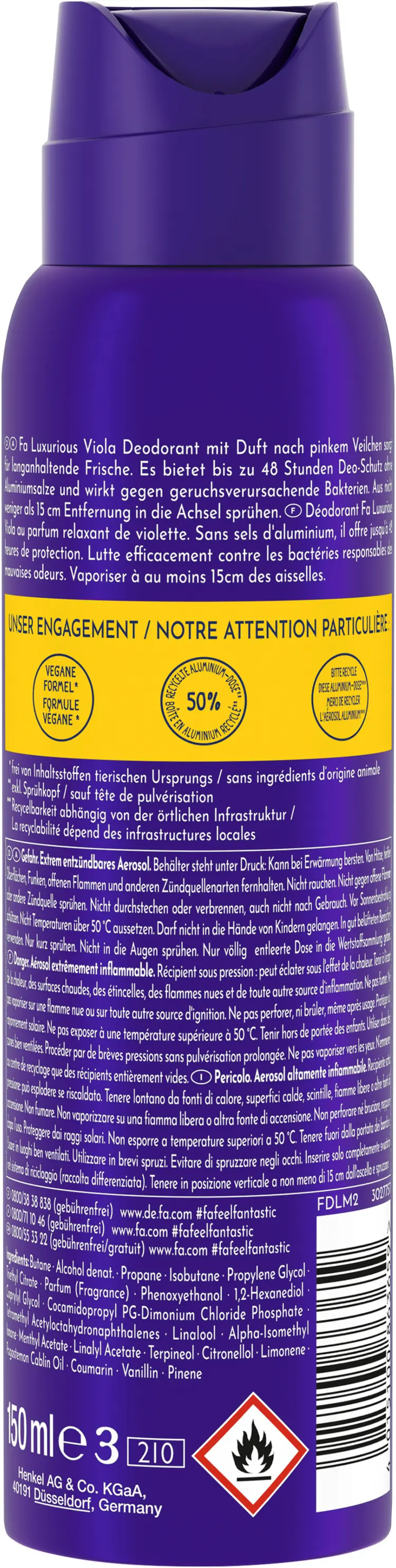Fa Luxurious Moments deodorantspray förtrollar din dag med den blommiga doften av rosa viol. Det starka 48h skyddet förhindrar obehagliga lukter utan att lämna fläckar. Dessutom är den hudvänliga och veganska formulan fri från aluminiumsalter.