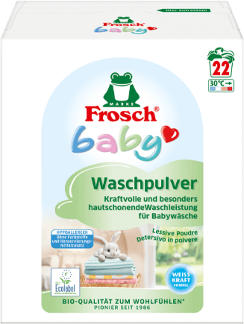 Babytvättpulvret från Frosch är lämpligt för vit och kokt tvätt och kan användas vid temperaturer från 30 °C till 95 °C. Den har en hög Rengöringsmedel kraft och tar bort all slags smuts på nolltid.
