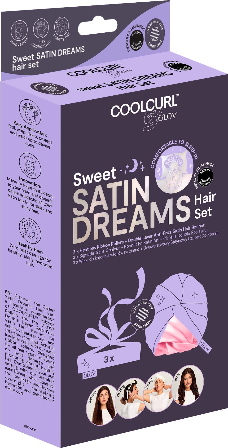 Upptäck Sweet Dreams Satin Set - en lyxig kombination av COOLCURL™ Ribbon Rollers och Double Layer Anti-Frizz Satin Hair Bonnet. Tillsammans lovar de värmefria lockar och frizzfria morgnar. De är designade för alla hårtyper och är särskilt skonsamma mot håret. Satinturban skyddar håret från hårbrott, fuktavfall och krusning och bibehåller lockarnas definition.