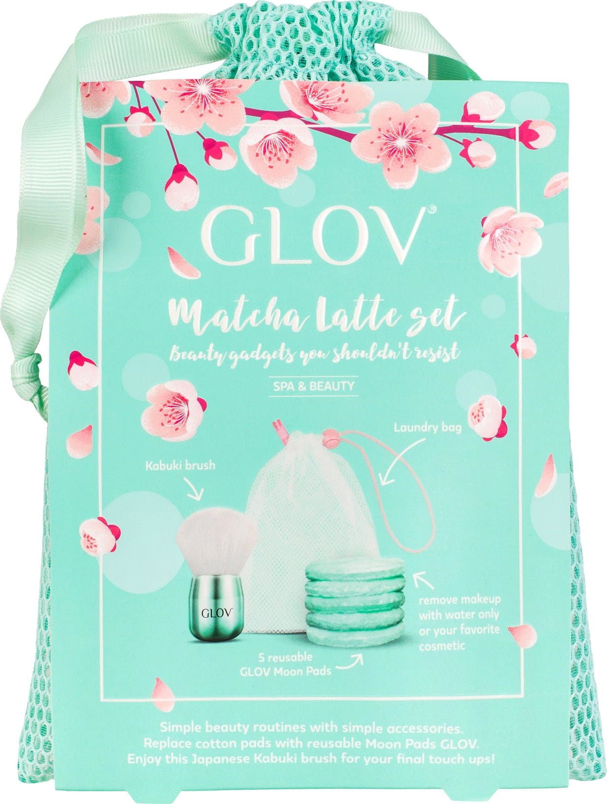 Detta set innehåller en fluffig Matcha Kabuki-borste för applicering av pulver, rouge eller foundation. Det innehåller även 5 återanvändbara GLOV Moon Pads för att ta bort smink och smink. Kuddarna kan förvaras och tvättas i den medföljande påsen.