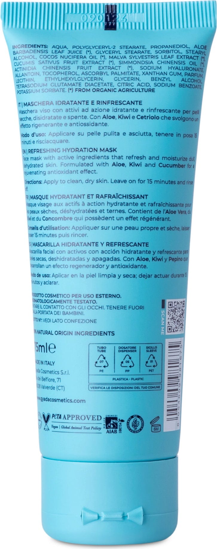 Denna ansiktsmask anpassar sig perfekt till torr och matt hud: blandningen av aloe vera, kiwi och gurka ger huden viktiga vitaminer och mineralsalter som har en reparerande och antioxidant effekt. Hyaluronsyra med hög molekylvikt återfuktar och skapar en skyddande folie över huden. Formuleringen avrundas med allantoin och malva, jojoba och kokosnötolja som gör huden underbart mjuk och skyddar den.