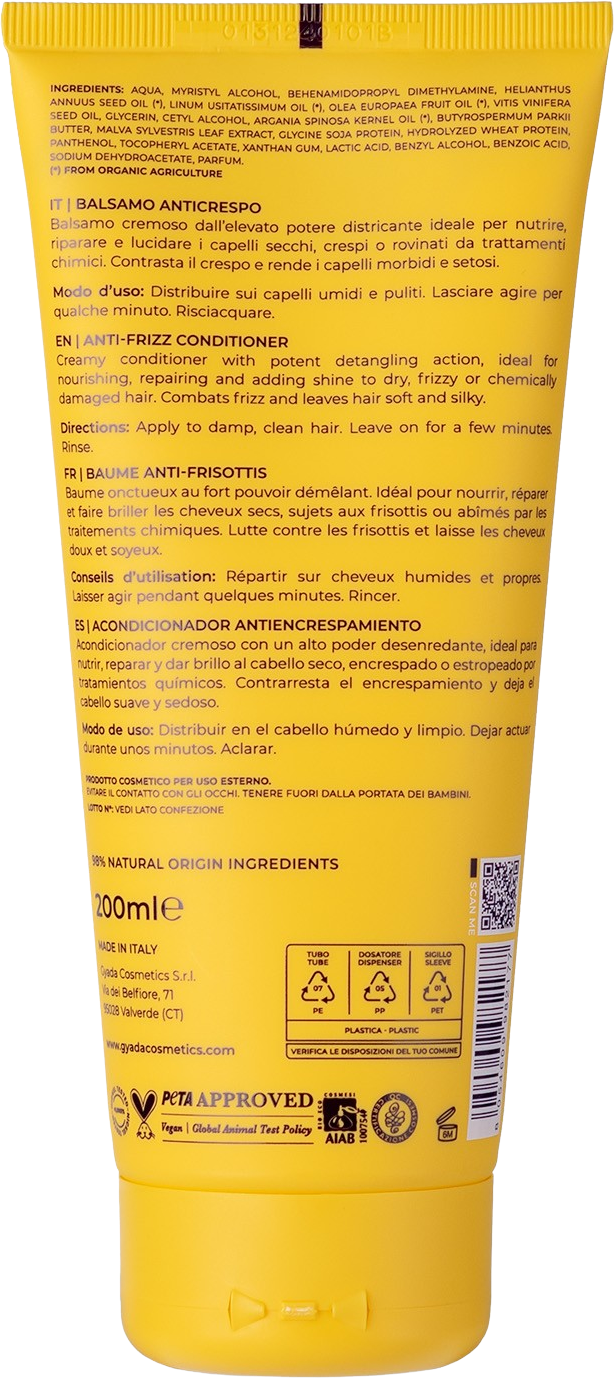 GYADA Cosmetics Anti-Frizz Balm är en försiktig omsorg för torrt, skadat och behandlat hår. Balsammet innehåller en blandning av örtoljor, sheasmör, malva-extrakt och hydrolyserat vete och sojaprotein. Den reder ut tovigt hår, reparerar och ger näring. Tillsammans hjälper ingredienserna till att återställa mjukhet och smidighet i håret.