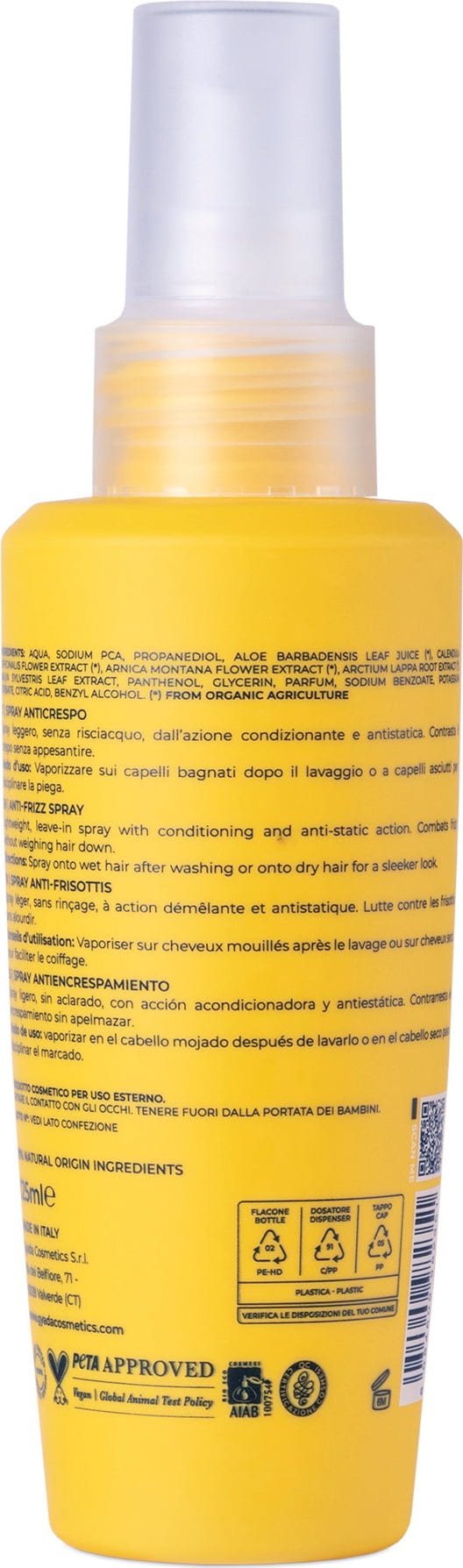Tack vare sin innovativa, fräscha och lätta formel, är Anti-Frizz Spray idealisk för styling av behandlat, stressat och orubbligt hår - oavsett om det är slät eller krökt. Den innehåller en blandning av organiska botaniska extrakt som har en antistatisk och närande effekt. Den håller utan att klibba eller skada håret. Det ger också en naturlig utstrålning och skyddar håret mot yttre påverkan.