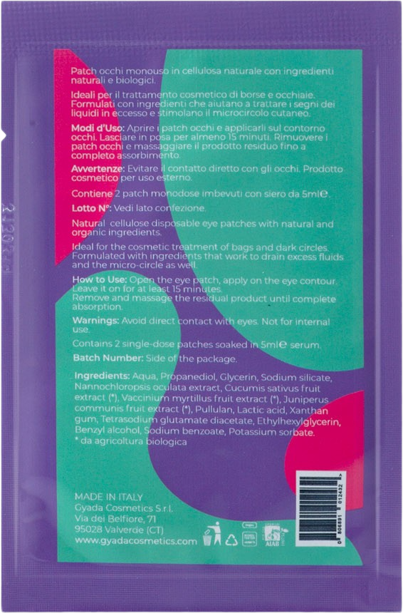 Plåstret för ögonen har formulerats med ingredienser som gurka, blåbär, ingefära och ett växtbaserat lyftkomplex som är perfekt för användning på ögonringar. Tygan är gjord av vegetabilisk cellulosa.