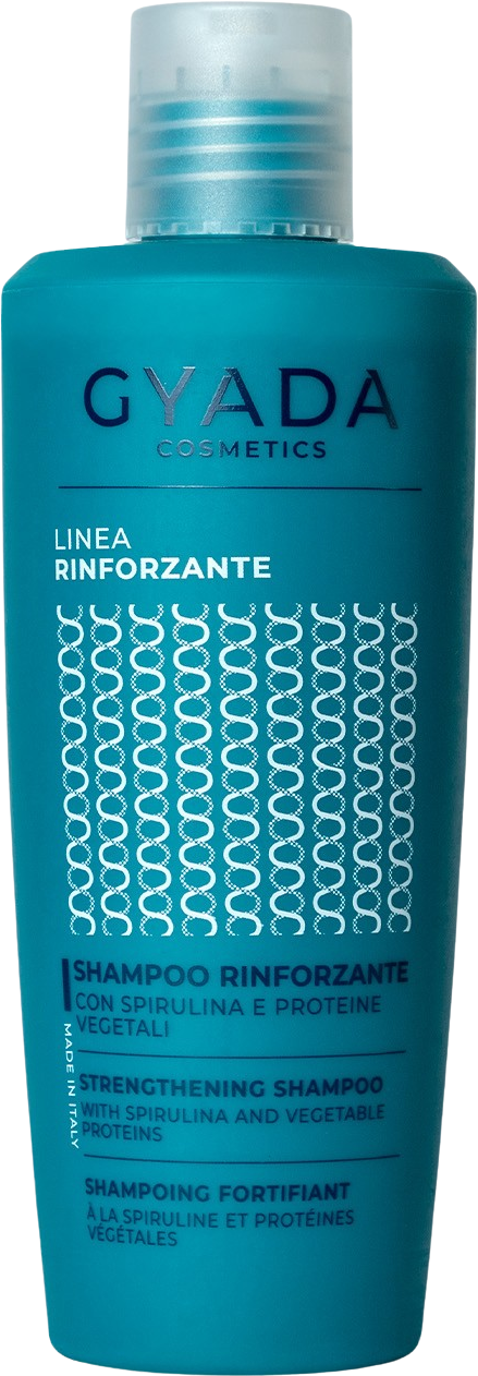 Gyadas förstärkande schampo ger stressat och tunt hår ny livskraft. Det är en koncentrerad produkt som återställer hår- och hårbotten och är lika lämplig för rengöring av torr och fet hårbotten. Den innehåller spirulina (marina alger rik på vitaminer, aminosyror och mineraler), fräkenväxt, ginseng och havre.