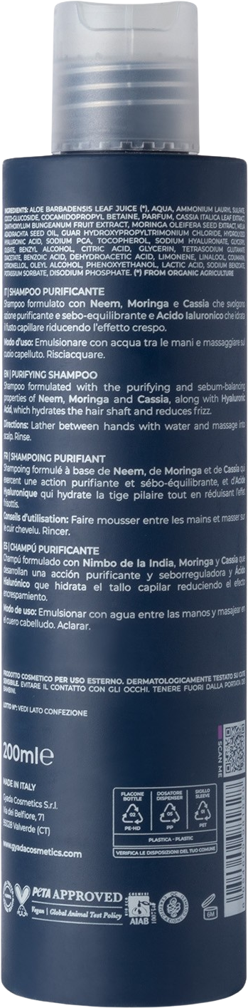 Purifying Shampoo från produktlinjen GYADA Cosmetics Hyalurvedic är formulerad med neem, moringa och cassia, vilket gör den perfekt för användning på oljigt, skadat och fint hår. Neem är känt för sina renande och talgreglerande egenskaper medan moringa stöder avgiftning av hårbotten. Schampot är berikat med kinesiskt pepparextrakt och förstärkande kassia. En ayurvedisk växtbaserad blandning i kombination med ett hyaluronsyrakomplex för ökad hydrering och skydd.