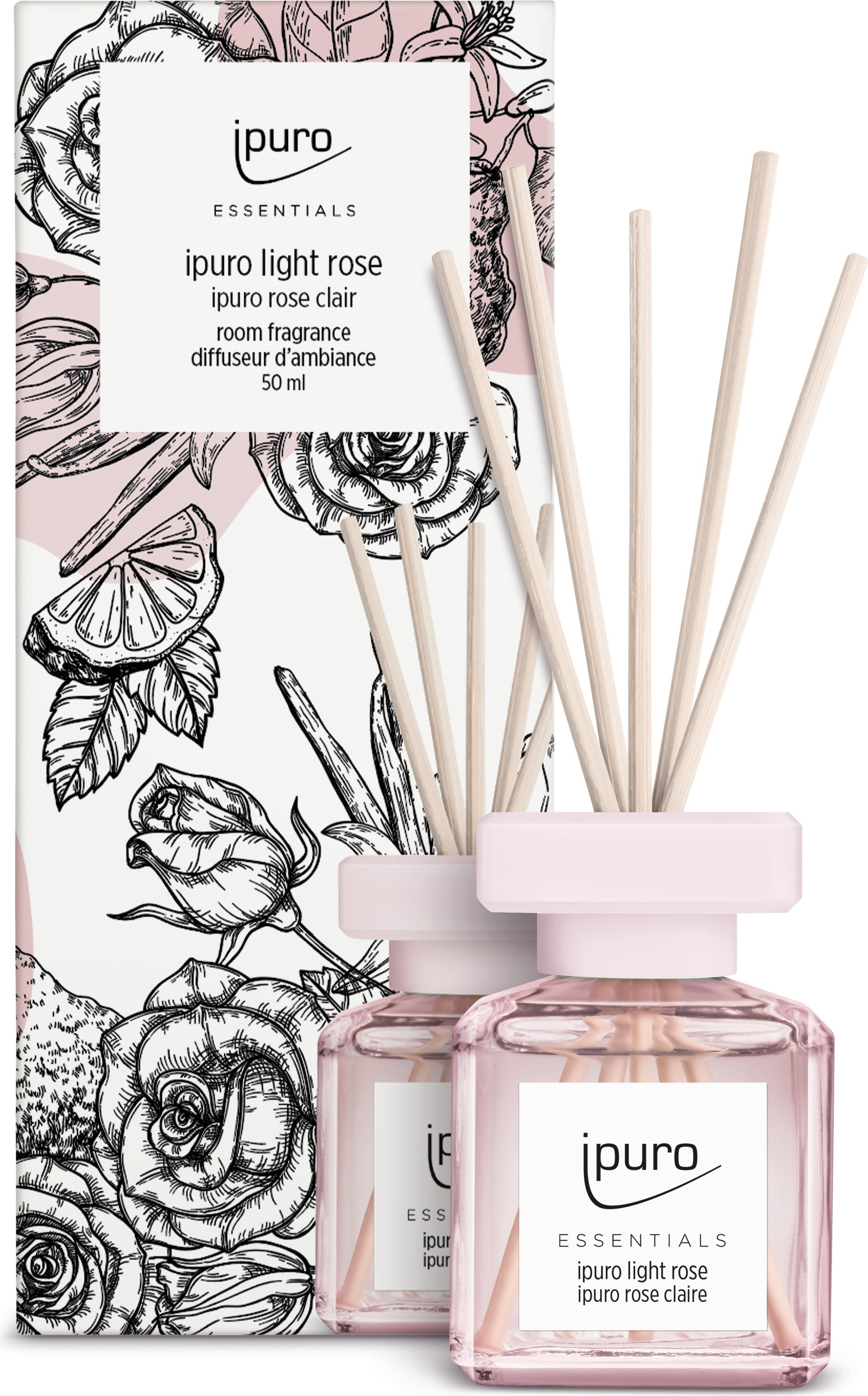 Rumdoften Essentials Light Rose från ipuro sprider en uppfriskande rosdoft i hela ditt vardagsrum. Fruktiga och söta nyanser av kanderad frukt, bergamott och vit mysk, samt milda vaniljnoter, förfinar den unika doften.