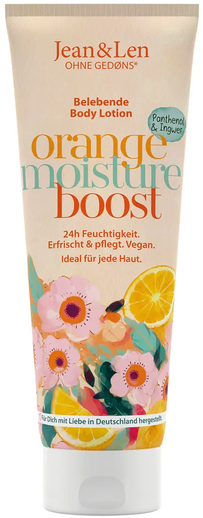 Skäm bort dig själv med den citrus-kryddiga doften hos den veganska Orange/Ginger Body Lotion by Jean&Len. Njut av den underbara känslan över hela kroppen när lotionen har absorberats av huden. Den lätta formulan vårdar kroppen med värdefulla ingredienser som urea, vegetabiliskt glycerin, panthenol, allantoin, apelsin- och ingefärsextrakt.