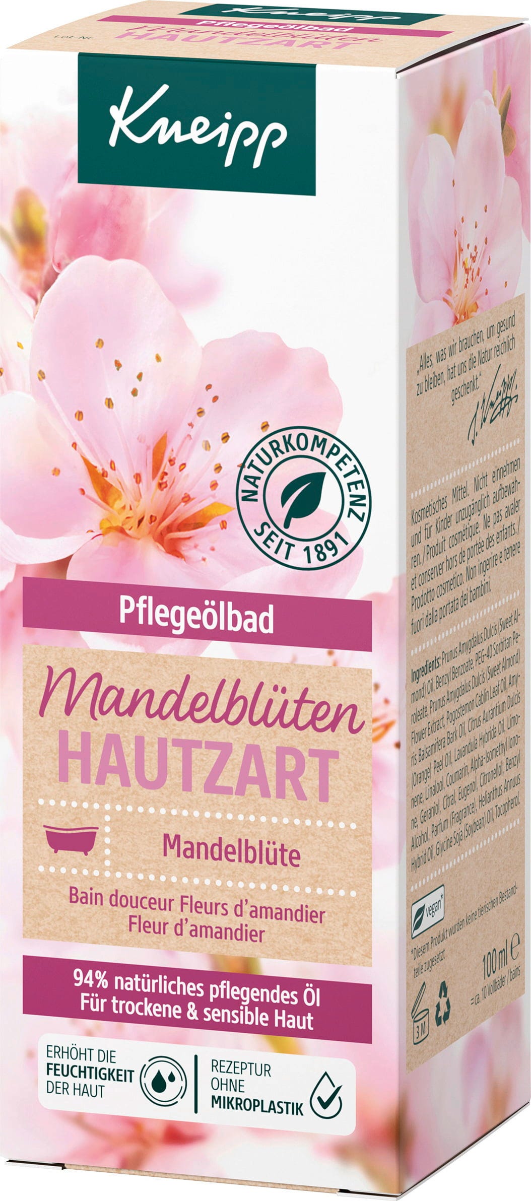 Med mandelblommans hudmjukgörande oljebad kan du ge din hud en behaglig och skonsam vård medan du badar. Den veganska och mineraloljefria formulan i det närande oljebadet innehåller 94% ren mandelolja. Detta skämmer bort torr och känslig hud i synnerhet.