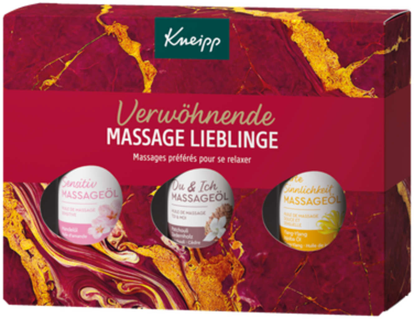 Detta Kneipp-presentset innehåller tre massageoljor i praktisk storlek för speciella stunder av välbefinnande. De värdefulla oljorna är lätta att applicera, absorberas behagligt och lämnar din hud mjuk och smidig. Varje doft utvecklas under massagen tack vare den frigjorda värmen, vilket gör varje massage till en verkligt njutbar upplevelse. En omtänksam present eller en liten njutning till dig själv.