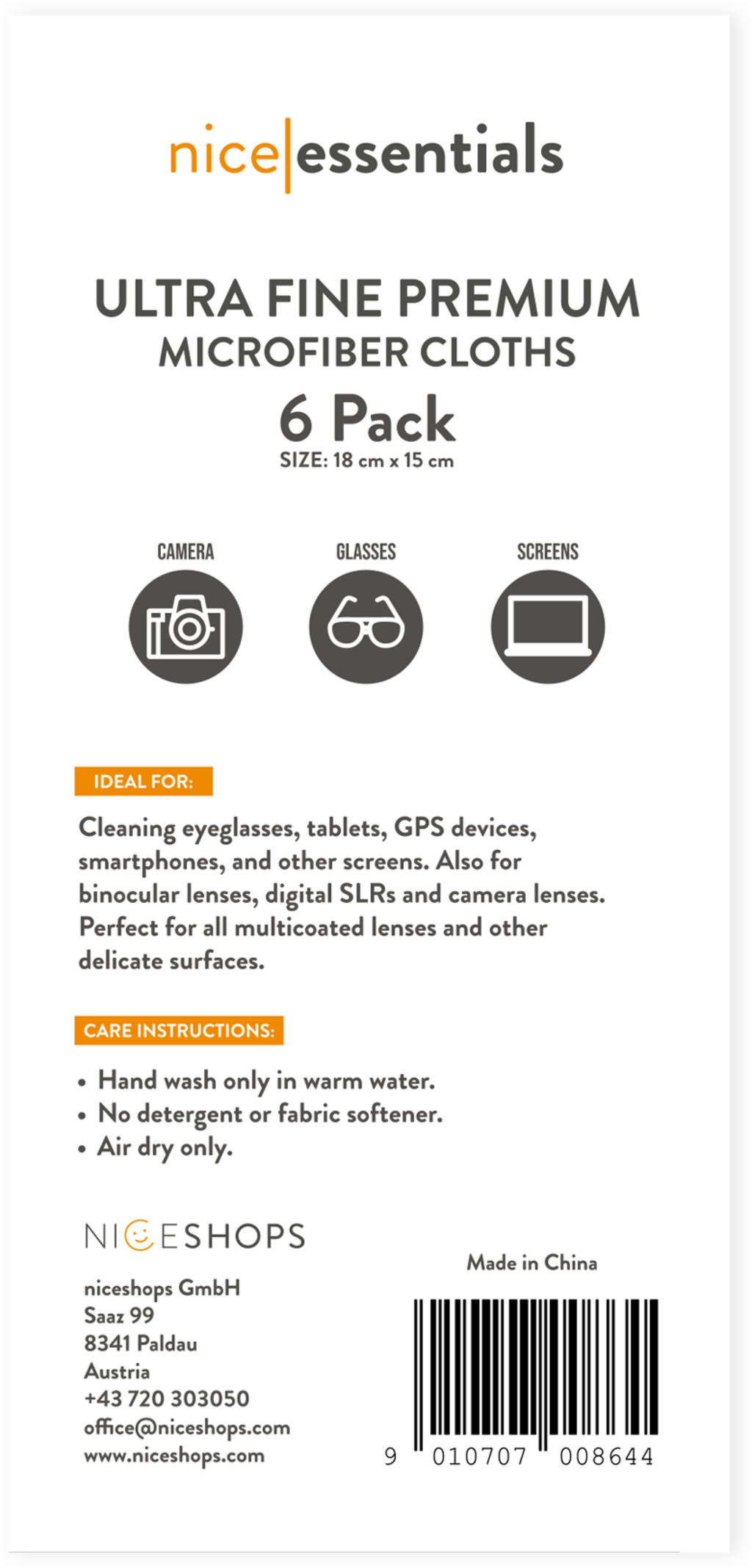 De ultrafina mikrofiberdukarna från nice essentials är perfekta för att rengöra känsliga ytor som glasögon, skärmar eller kameralinser – grundligt och skonsamt. Det högkvalitativa, tätvävda mikrofibermaterialet drar till sig damm, smuts och olja på ett effektivt sätt och tar bort irriterande fingeravtryck – helt utan repor eller ludd.