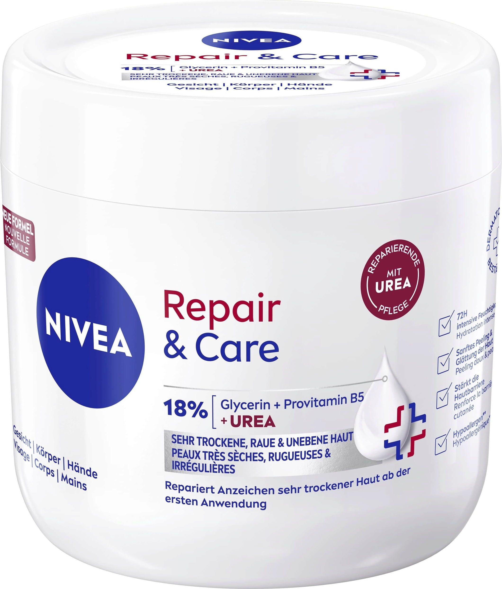 Stressad hud är ofta outhärdligt torr eller känns obehagligt sträv. För att kompensera för en obehaglig känsla på huden har Nivea utvecklat sin Body Cream Repair & Care Glycerin + Urea em> Med 12% glycerin och viktigt E-vitamin kan texturen minska känslan av stramhet och återställa fukt till torr hud i upp till 72 timmar. Intensivvården skyddar även hudbarriären från att torka ut igen snabbt absorberad och icke-fet Hudkänsla efter varje användning.