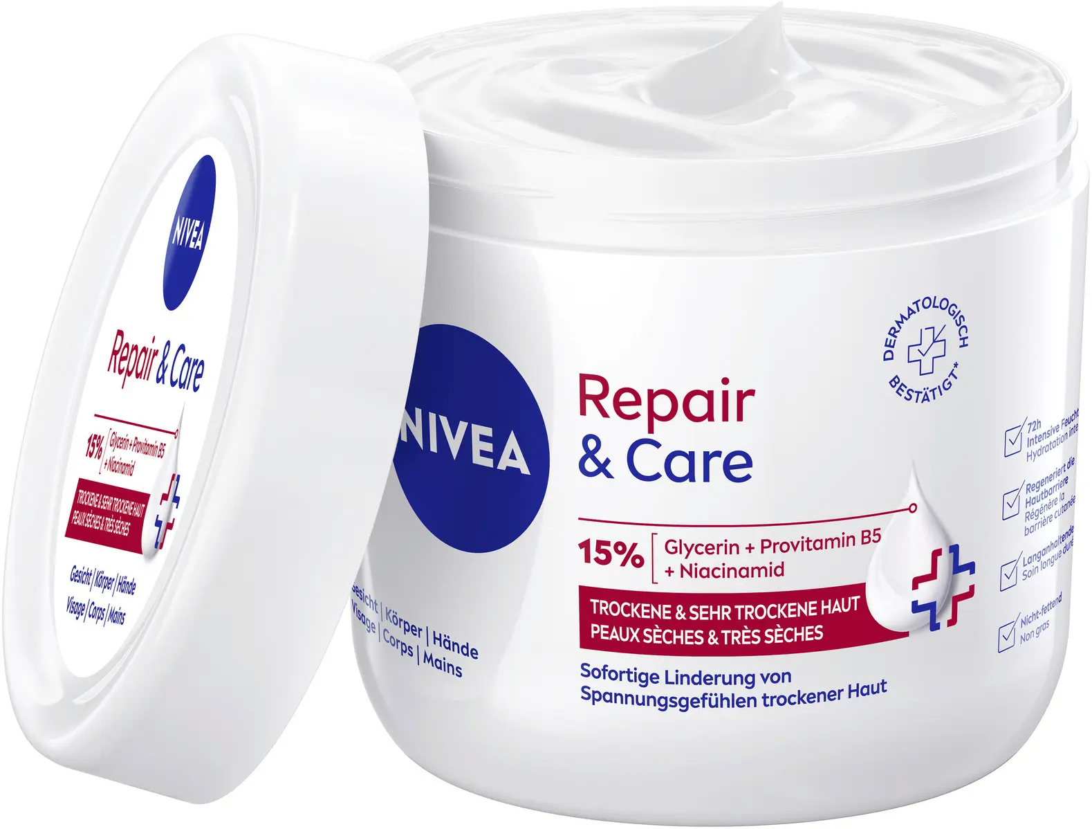 NIVEA Repair & Care Cream kan appliceras på kropp, ansikte och händer. Dess värdefulla formula, berikad med glycerin, vitamin E och panthenol, ger långvarig återfuktning och gör huden mjuk. Krämen är även lämplig för barn från 3 år och uppåt.