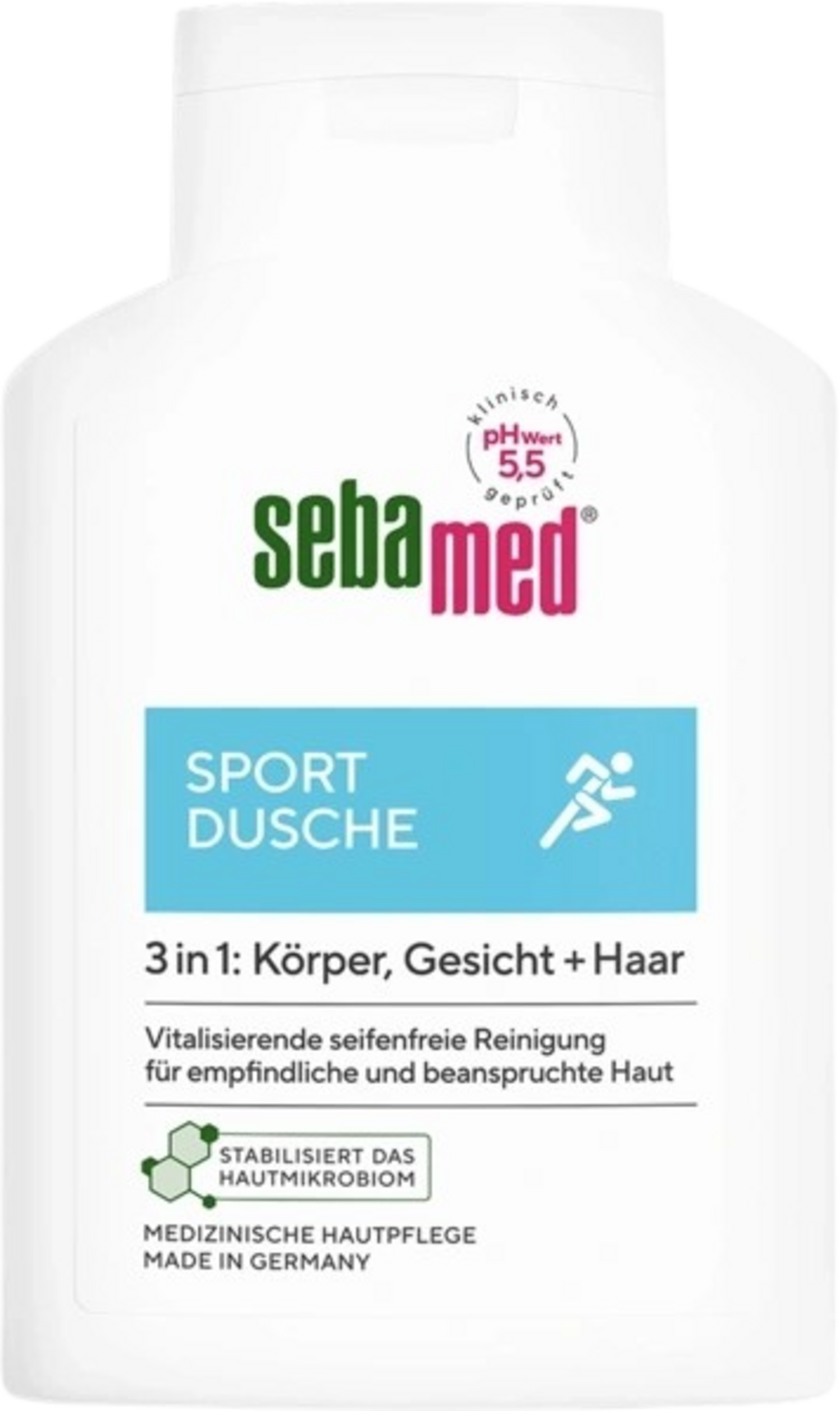 Sportduschen 2in1 från sebamed rengör på ett tillförlitligt och skonsamt sätt din känsliga och stressade kroppshud samt ditt hår efter varje träningspass. Huden känns omedelbart uppfriskad och vitaliserad. Formulan har ett pH-värde på 5,5 som är anpassat till huden och stöder därför även hudens naturliga skyddslager.