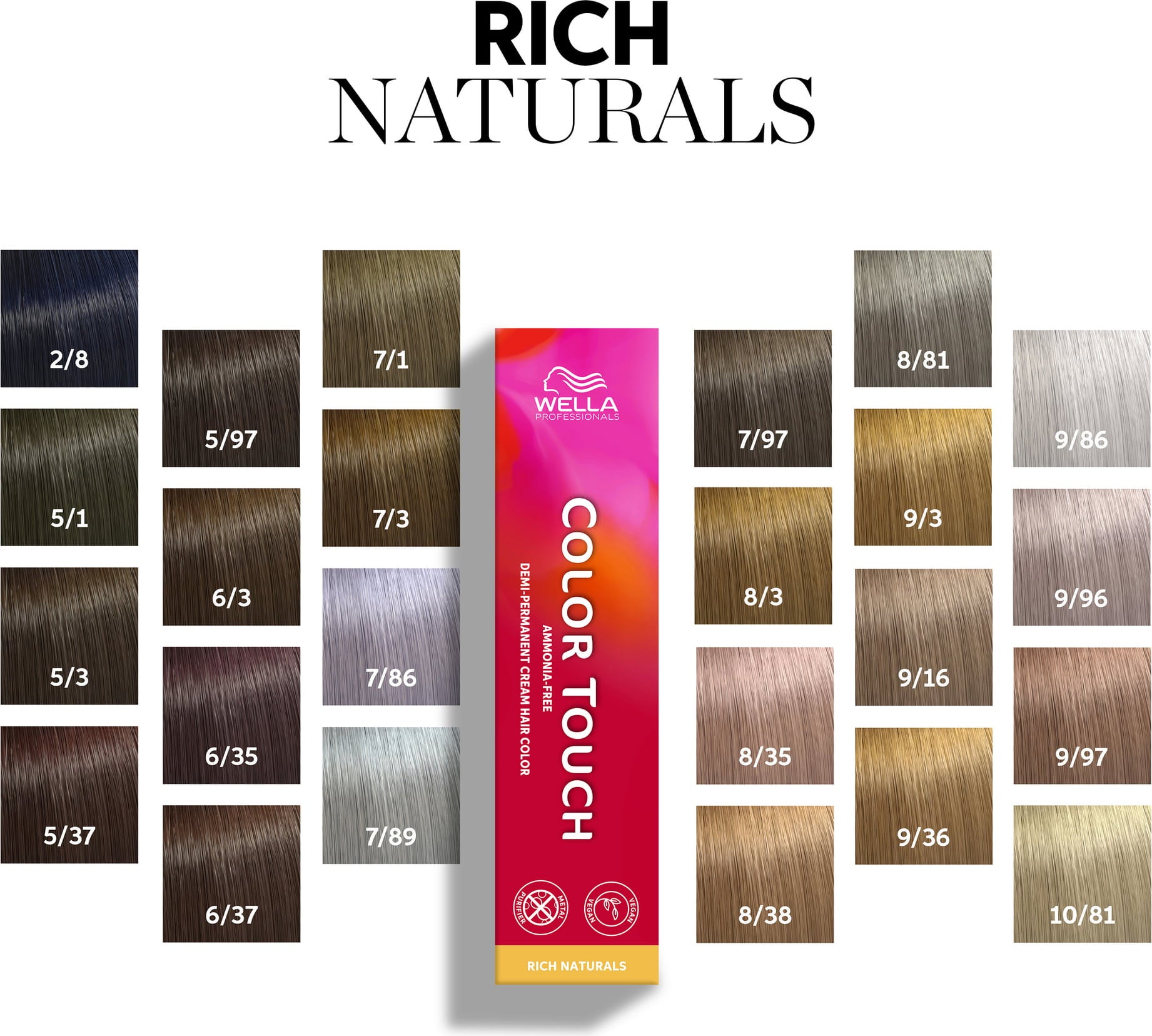 Color Touch Rich Naturals är demi-permanenta intensiva färgämnen i naturliga nyanser som håller i upp till 28 hårtvättar. Den medföljande Metal Purifier Technology säkerställer att tillförlitliga färgresultat kan uppnås.