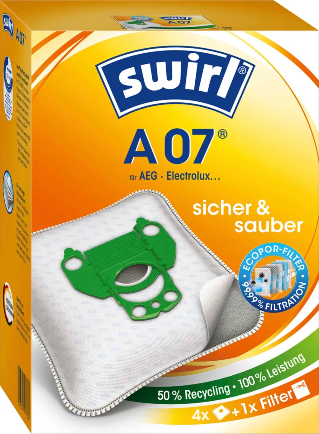 Swirl EcoPor® dammsugarpåsar erbjuder dig en pålitlig och ren lösning för ditt hem. De fångar säkert damm, smuts och allergiframkallande partiklar inuti påsen, vilket säkerställer en märkbart fräschare känsla i ditt rum. Det integrerade EcoPor®-filtret avlägsnar en stor del av det uppsugna fina dammet från luften, medan Dirtlock®-dammtätningen möjliggör ren avfallshantering utan att släppa ut dammoln.
