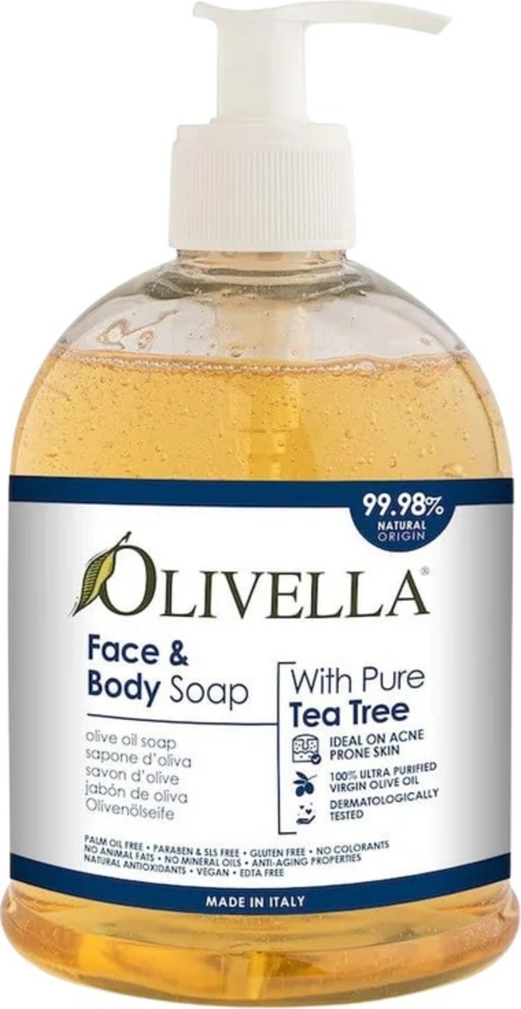 Denna flytande, palmoljefria ansikts- och kroppstvål från Olivella är gjord med oliv- och tea tree-olja och är idealisk för oren och fet hud. Kombinationen av tea tree- och olivolja stödjer huden vid orenheter tack vare dess höga innehåll av antioxidanter och polyfenoler. Den delikata, kryddiga jordiga doften av tea tree och lavendel ger extra uppfriskning.