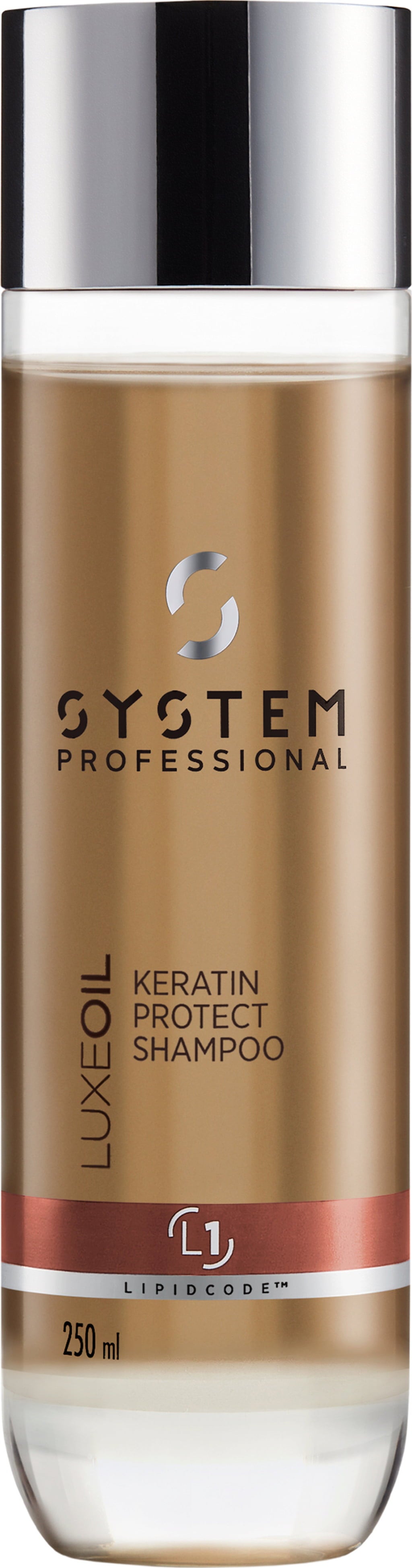 LuxeOil Keratin Protect Shampoo från System Professional LipidCode rengör och ger näring åt håret med lyxiga oljor som arganolja, jojobaolja och mandelolja.