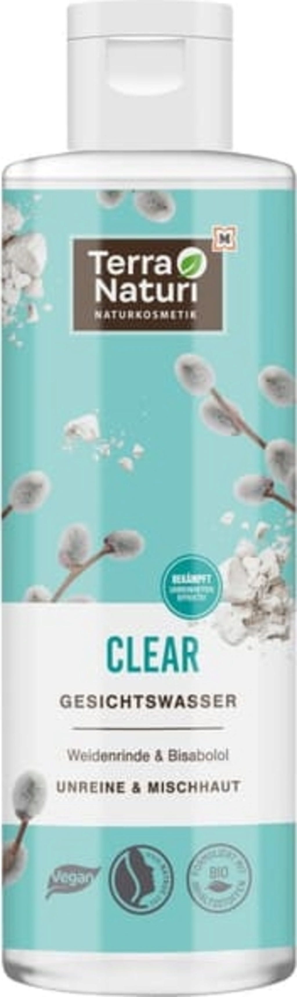 Det veganska Terra Naturi Clear ansiktsvattnet är berikat med växtbaserat bisabolol och extrakt av pilbark och ger en skonsam rengöring av ansiktet. Det avlägsnar effektivt smuts och döda hudceller. Ansiktsvattnet passar bra för oren hud och blandhy.