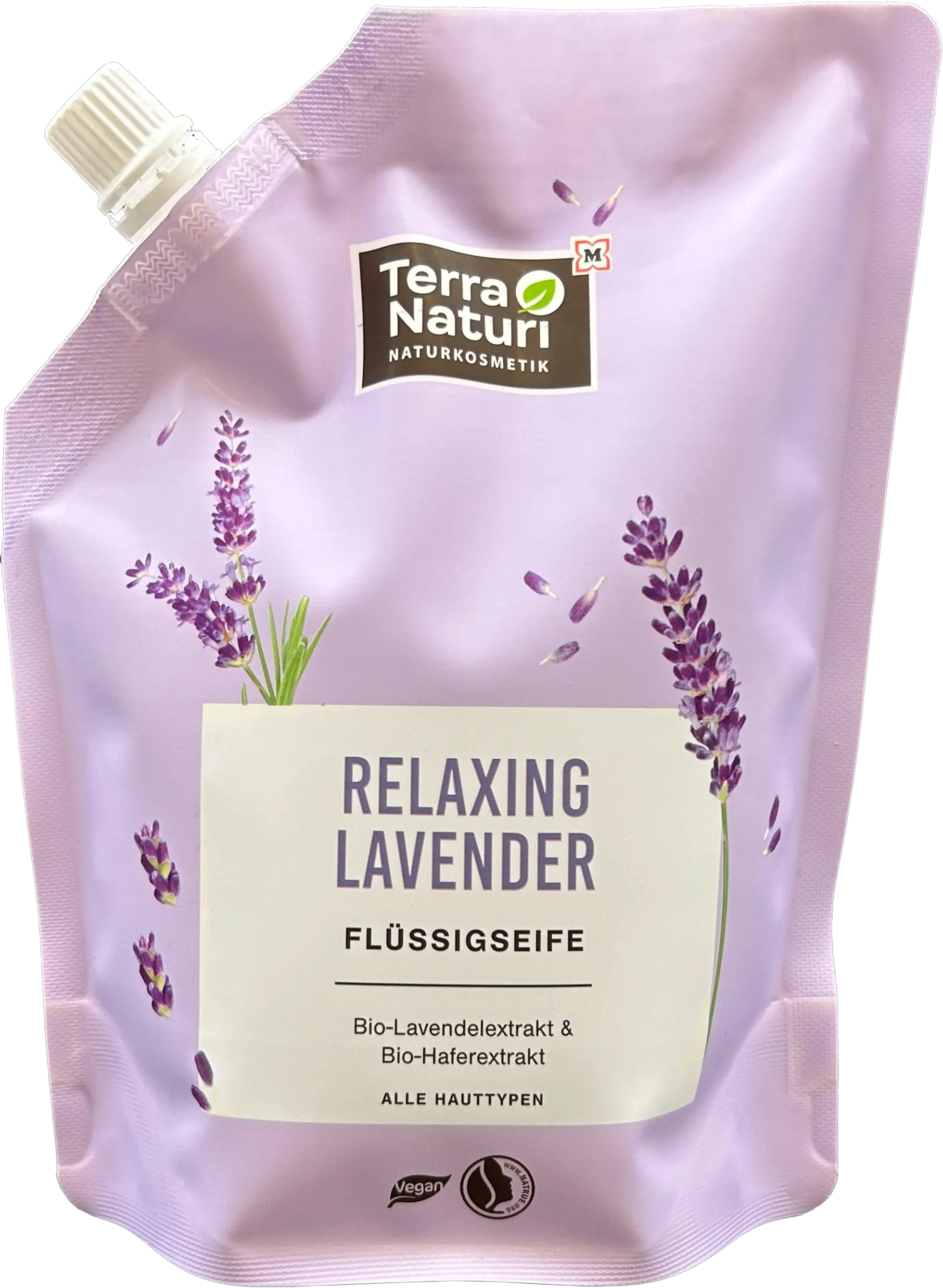 Mild flytande tvål, berikad med ekologiskt lavendel- och havreextrakt – Relaxing Lavender flytande tvål från Terra Naturi rengör dina händer med en vegansk och NaTrue-certifierad formulering.