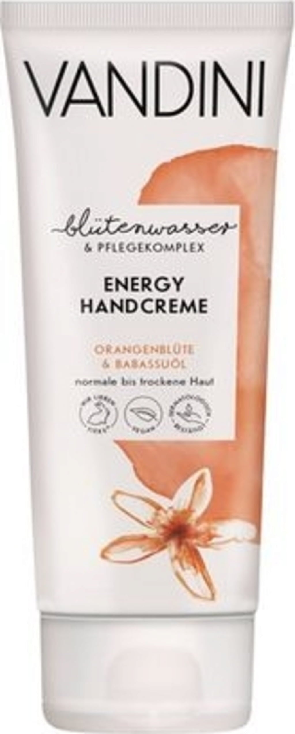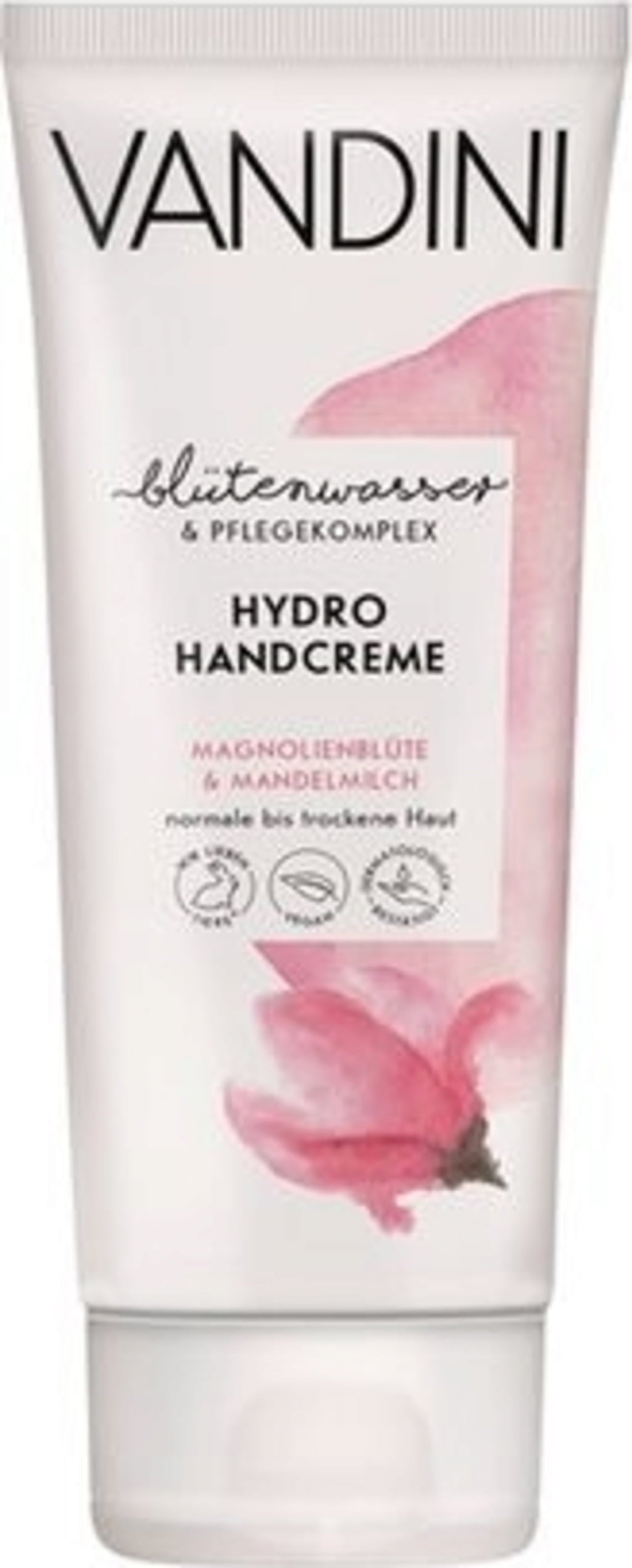 VANDINI Hydro Hand Cream ger intensiv fukt med magnoliablomvatten, vårdande mandelmjölk och värdefullt sheasmör. Tack vare apelsinblomvatten, babassuolja och allantoin vitaliserar och balanserar krämen från Energy-serien hudens fuktbalans.