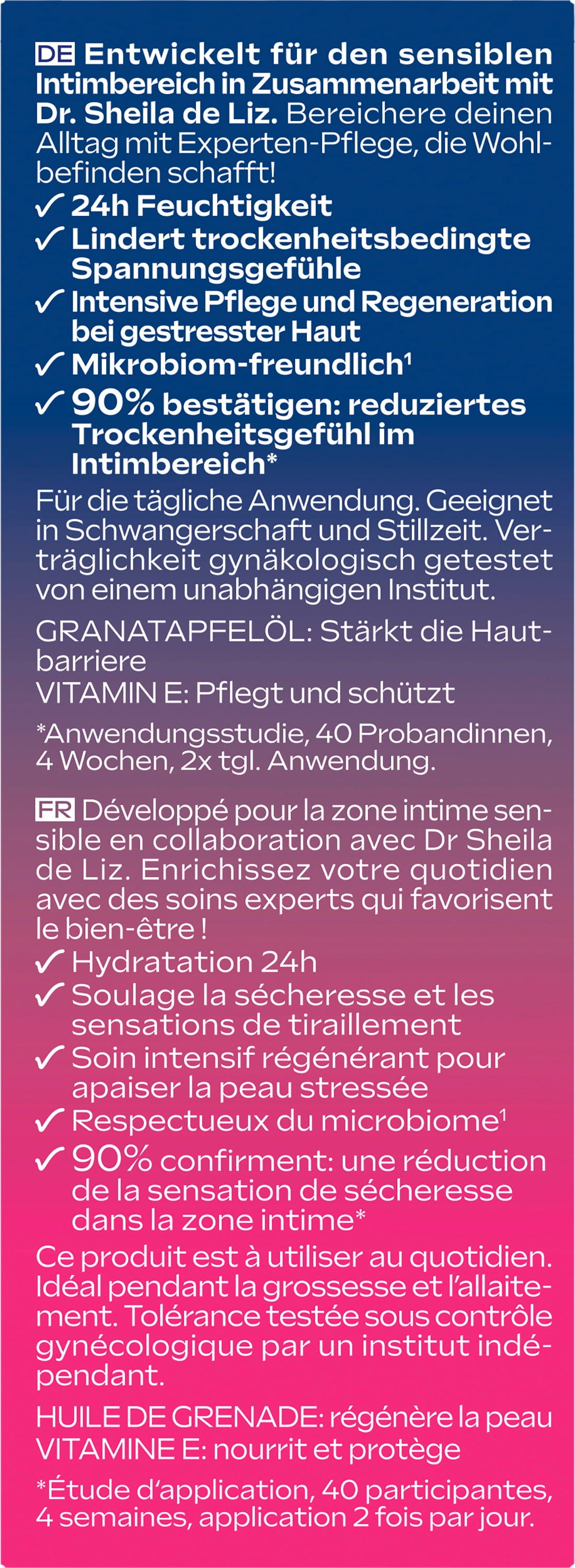 Denna Vlora sammetsskyddande olja utvecklades i samarbete med Dr. Sheila de Liz. Den berikar din vardag med expertvård för det känsliga intimområdet och förebygger känslor av stramhet orsakad av torrhet.